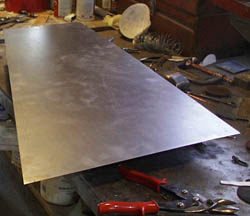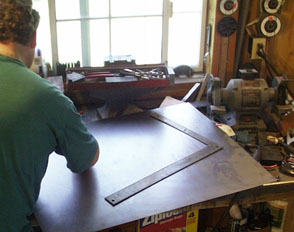 2. Paul don't need no stinking paper! He transfers his careful (and multiple) measurements right to a sheet of clean 20 gauge steel..just the same as used on the original hood.