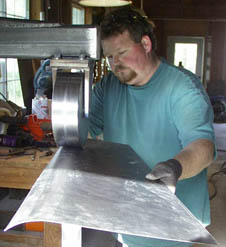6. Another essential tool for clean metal work is an english wheel. A wheel is simply a stretching device and is just like a hammer, but different :~) Think of the metal as a big piece of really hard, stale chewing gum. As we run this between the two round wheels or anvils it squeezes and makes the gum/metal thinner in the place we have wheeled it. By stretching the metal thus and bending a bit at the same time whe can change it's shape. See the hood sides forming here?