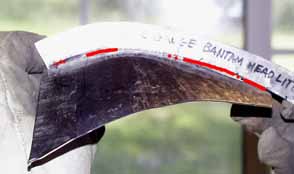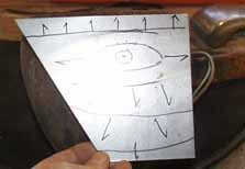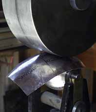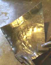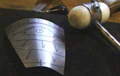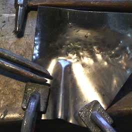 Here, another ho-made tool (left) makes the ruffle: It looks like a heron's beak which "bites" the metal...(twist twice..once in each direction or else you get a sine wave not a ruffle) and I clamp both sides to the table so when I start pounding on it it can't escape to the sides. Start at the top of the ruffle and pound towards youreslf, being careful not to crease the metal...just make it thicker (crowd those molecules together)...maybe you will notice a slight bulge where the metal has tried to "escape" out the front from between the two clamps? That's okay...you want the end to end dimension to be less..to shrink..you can always trim up the front later. How do you know it os shrinking? Because it curls up like a green leaf in a fire...(that's also shrinking right?)