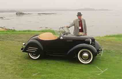 As we inch along I find myself eventually abreast of one of the wings of the Lodge, and who should stumble out of his room to take it all in but Jay Leno himself, the Crowned Prince of Pebble Beach, along with Ralph Lauren I guess I should say. He hasn't even brushed his hair yet and is rubbing it around in a sort of semi puzzlement at the little Bantam. He got the make right but thought it would be a '36. I said '39 and went on to admonish in a sort of mock authoritative voice "..And no cracks! You comedians ruined this company in the first place!" It's not a line he can work with since he probably doesn't know the history of all the jokers falling in and out of our cars. Naturally it is at this point that the line starts to move right along so we conclude with the usual stuff about beautiful car and so on.The interview is over.